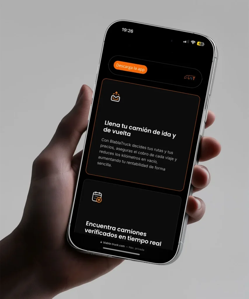 Para el proyecto de BlablaTruck, el desafío fue digitalizar la logística de transporte de mercancías, conectando a transportistas y empresas mediante una plataforma que optimiza rutas y reduce kilómetros en vacío. Mi trabajo se centró en desarrollar un entorno web que no solo presenta el servicio, sino que actúa como el puente de confianza necesario para gestionar cargas críticas.