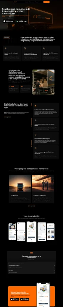 Implementé una arquitectura de información que prioriza las funcionalidades clave del ecosistema: geolocalización en tiempo real, pagos protegidos y verificación de perfiles. El diseño está estratégicamente orientado a la conversión y descarga de la app, garantizando que la complejidad de la logística se traduzca en una experiencia de usuario sencilla, transparente y profesional desde cualquier dispositivo.