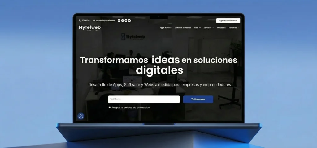 Desarrollé la web corporativa de Nytelweb con el reto de proyectar su autoridad técnica en software a medida, IA y aplicaciones móviles. Como parte activa del equipo técnico y comercial, traduje la complejidad de estos servicios tecnológicos en una interfaz WordPress funcional, orientada a reflejar una trayectoria de más de 1.000 proyectos realizados.