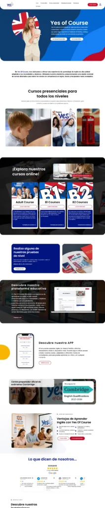 Para el proyecto de Yes of Course, el objetivo fue transformar una academia de inglés física en un ecosistema digital completo. El reto principal residió en la implementación técnica de un sistema de gestión de aprendizaje (LMS) avanzado dentro de WordPress, permitiendo a la institución centralizar toda su oferta formativa, tanto para cursos presenciales como online.